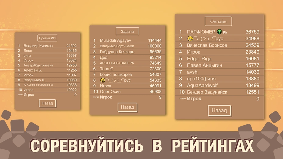 - 🤖 Рейтинг игры с компьютером — здесь учитываются ваши результаты против ИИ. Даже играя с машиной, можно соревноваться с другими игроками, кто лучше справляется с искусственным интеллектом.